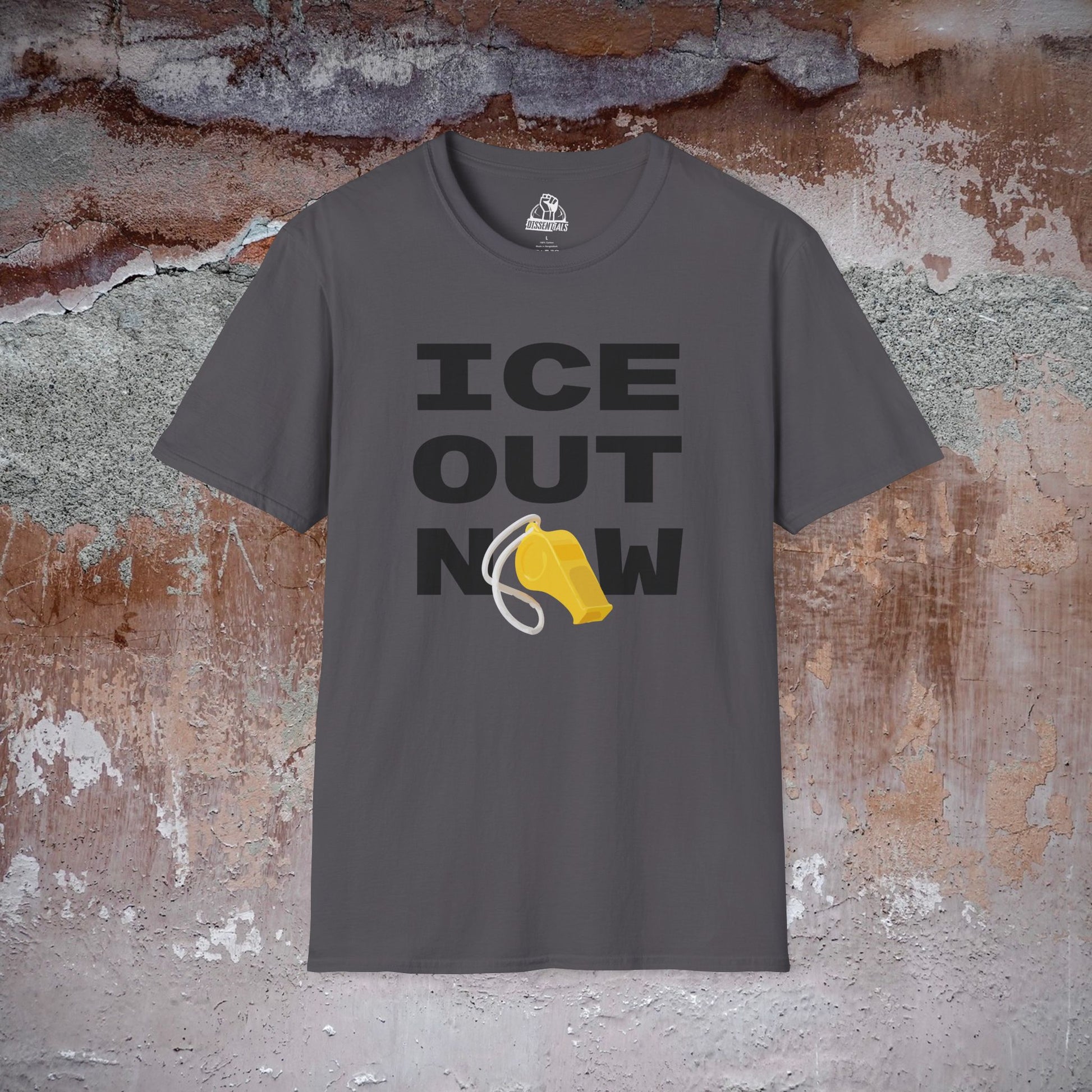 Unisex softstyle T-Shirt featuring an image of a whistle and the phrase "ICE OUT NOW". This shirt celebrates the diversity of our neighborhoods and courageous acts of resistance in the face of power. It is ideal for use during protests, rallies, marches, and political events.